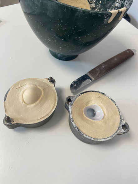 Les prothèses oculaires se font entièrement à la main par l'oculariste, de l'empreinte, au moule, à la fabrication, chaque étape demande beaucoup de précision. Les iris sont peints par l'oculariste sur des petits support à l'aide de 5 pigments naturels et les veines vont être représentées avec de la laine rouge effilée.